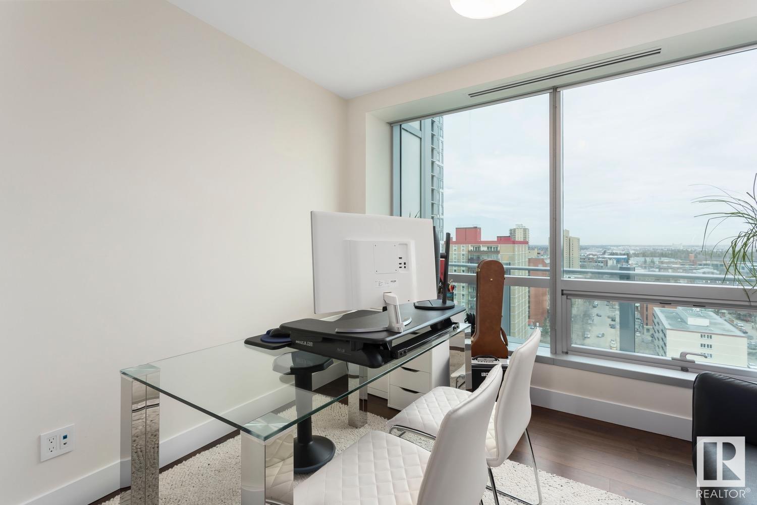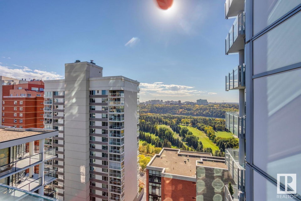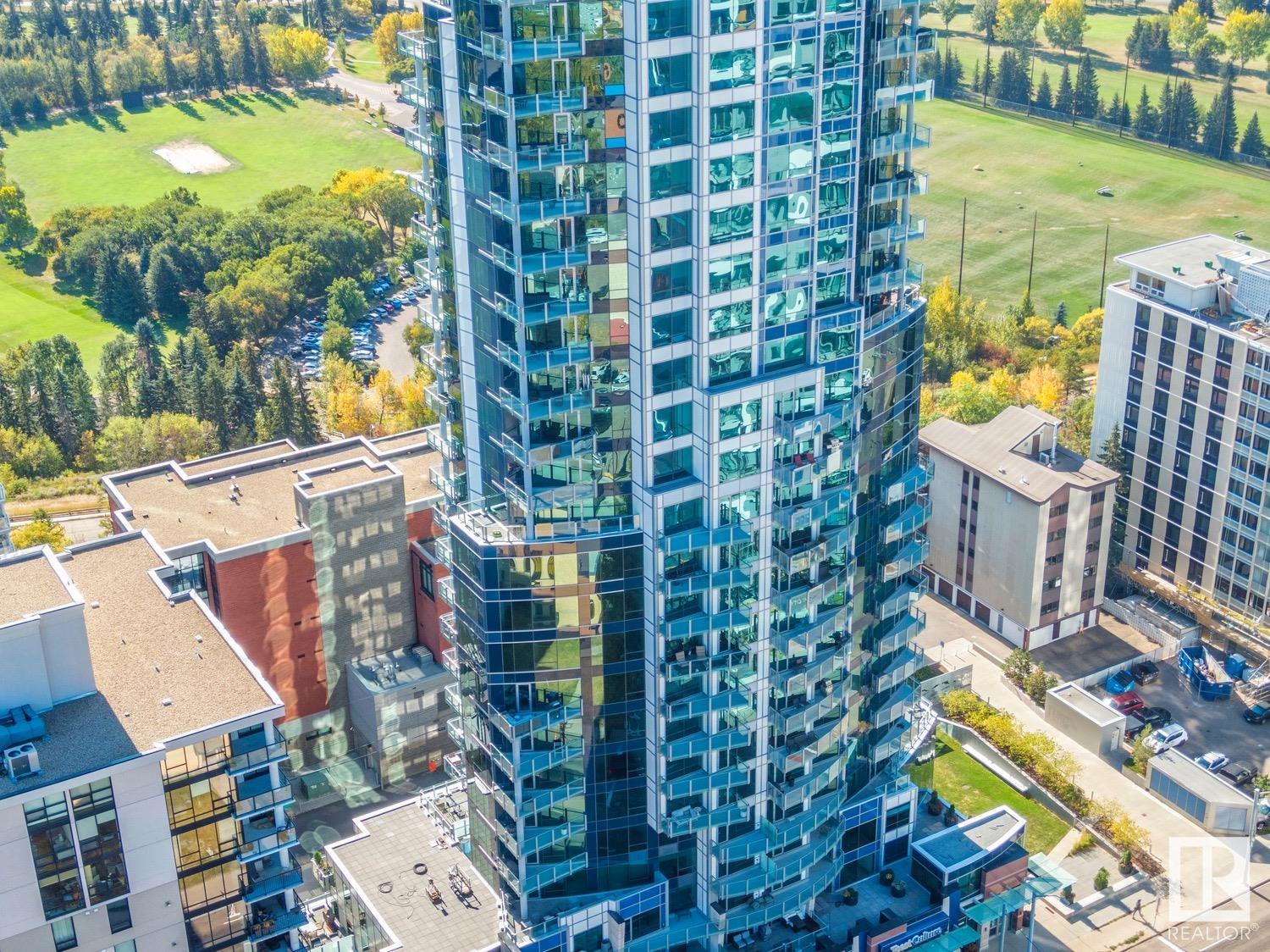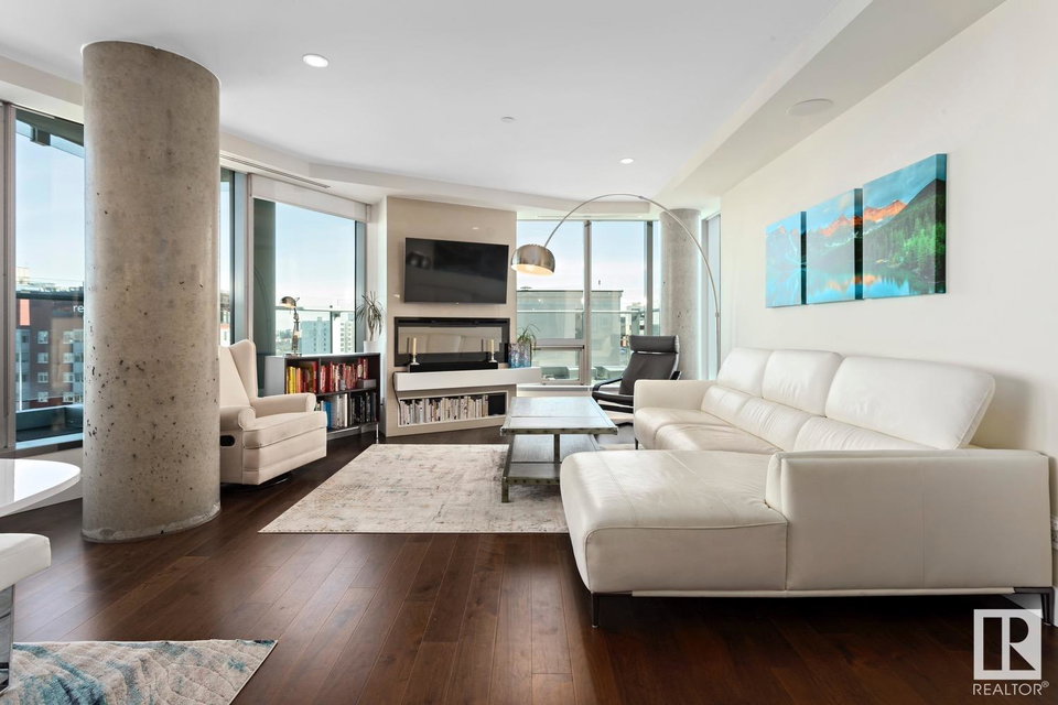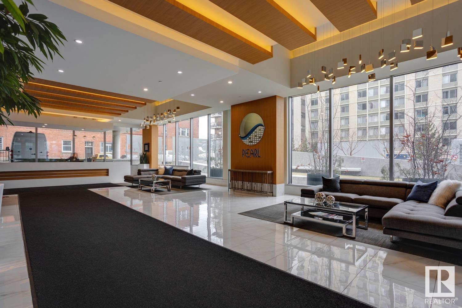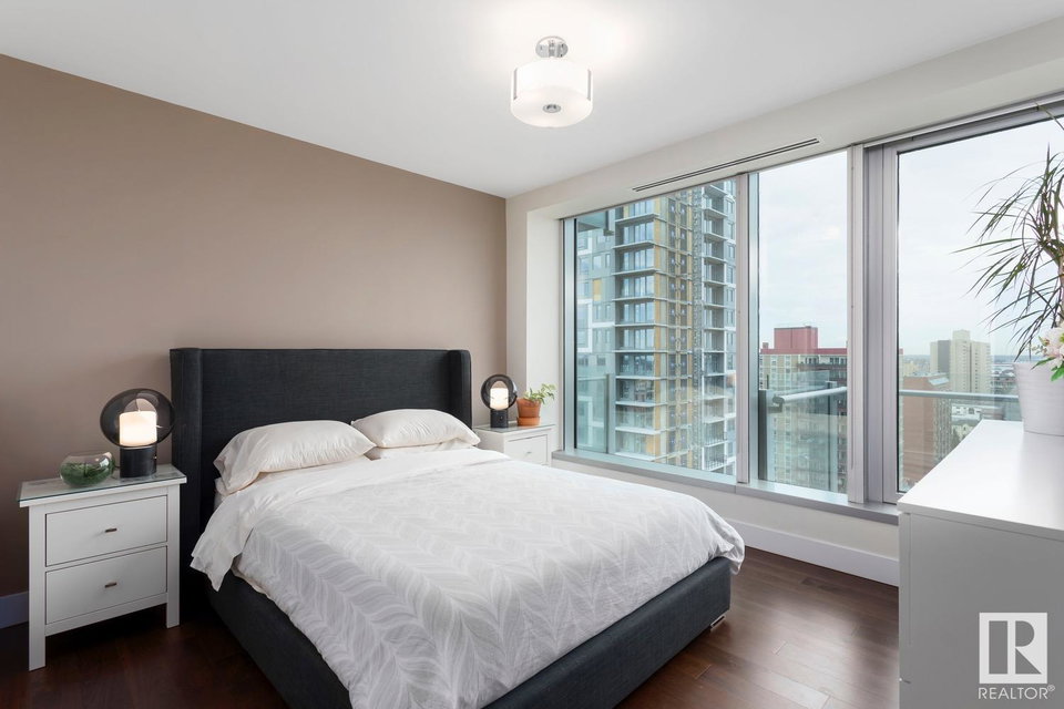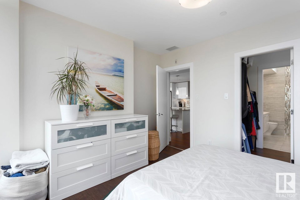 2 BED+DEN/2 BATH/2 TITLED UNDERGROUND STALLS in one of YEG’s finest developments. Pearl Tower is one of the only buildings to offer CONCIERGE SERVICES in YEG. From the elegant lobby to the impressive front doors of each suite, the quality of this building is clear. This CORNER UNIT boasts 2 BALCONIES & views of the DT skyline & River Valley. Warm hardwood runs throughout the unit, contrasted w. bright, white European cabinetry in the kitchen & bathrooms. Upgraded Bosch & JennAir appliances, stone tile & quartz countertops also compliment the fine finishes. Perfect for roommates (or houseguests), the floor plan has bedrooms on opposite sides of the home (each w. full bathrooms) & all closets have custom organizers. Integrated window coverings, fireplace & A/C are added bonuses for this property. 2 TITLED, UNDERGROUND stalls (1 with EV charging capabilities; rare to find in the core). The PET FRIENDLY building is complete w. gym, social room & is walking distance to River Valley, shopping & DT attractions.