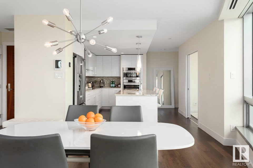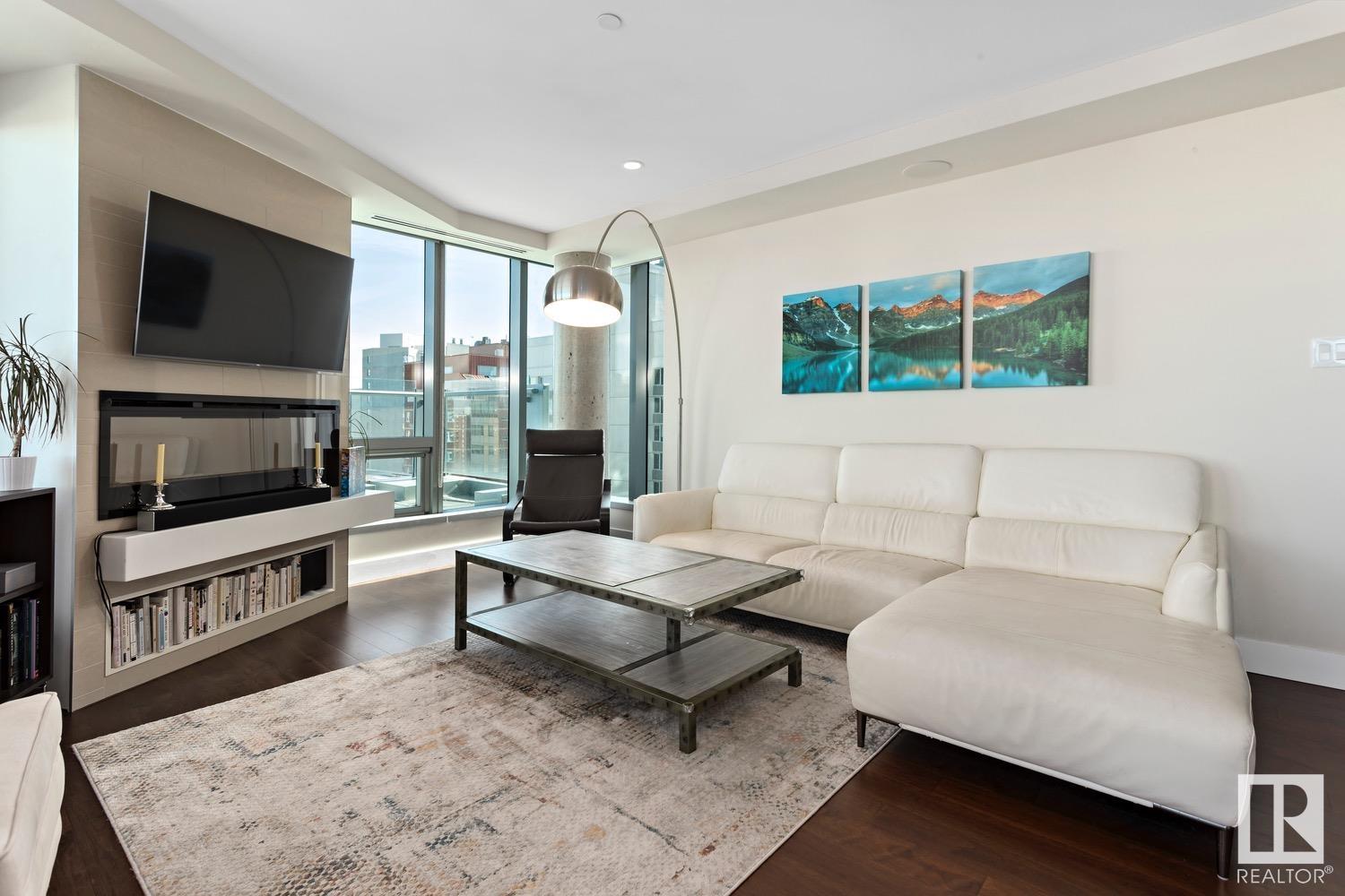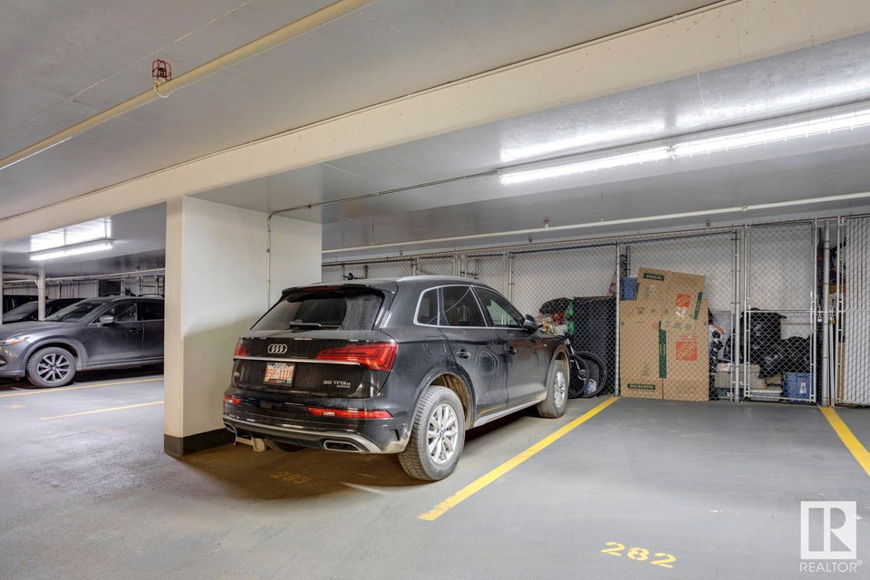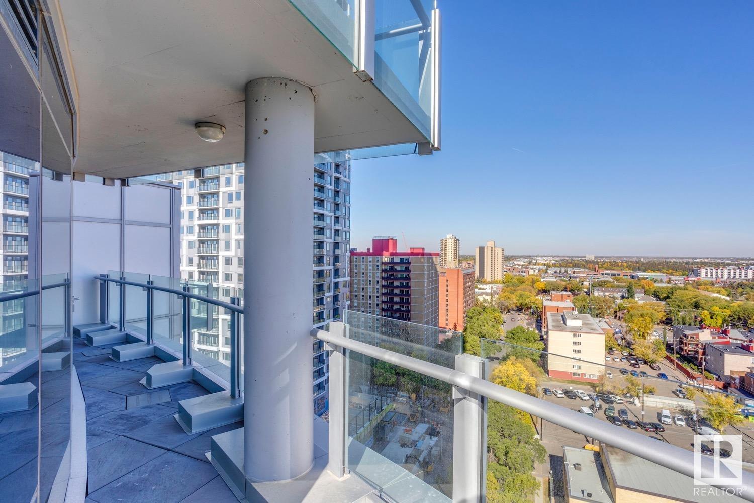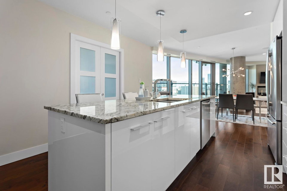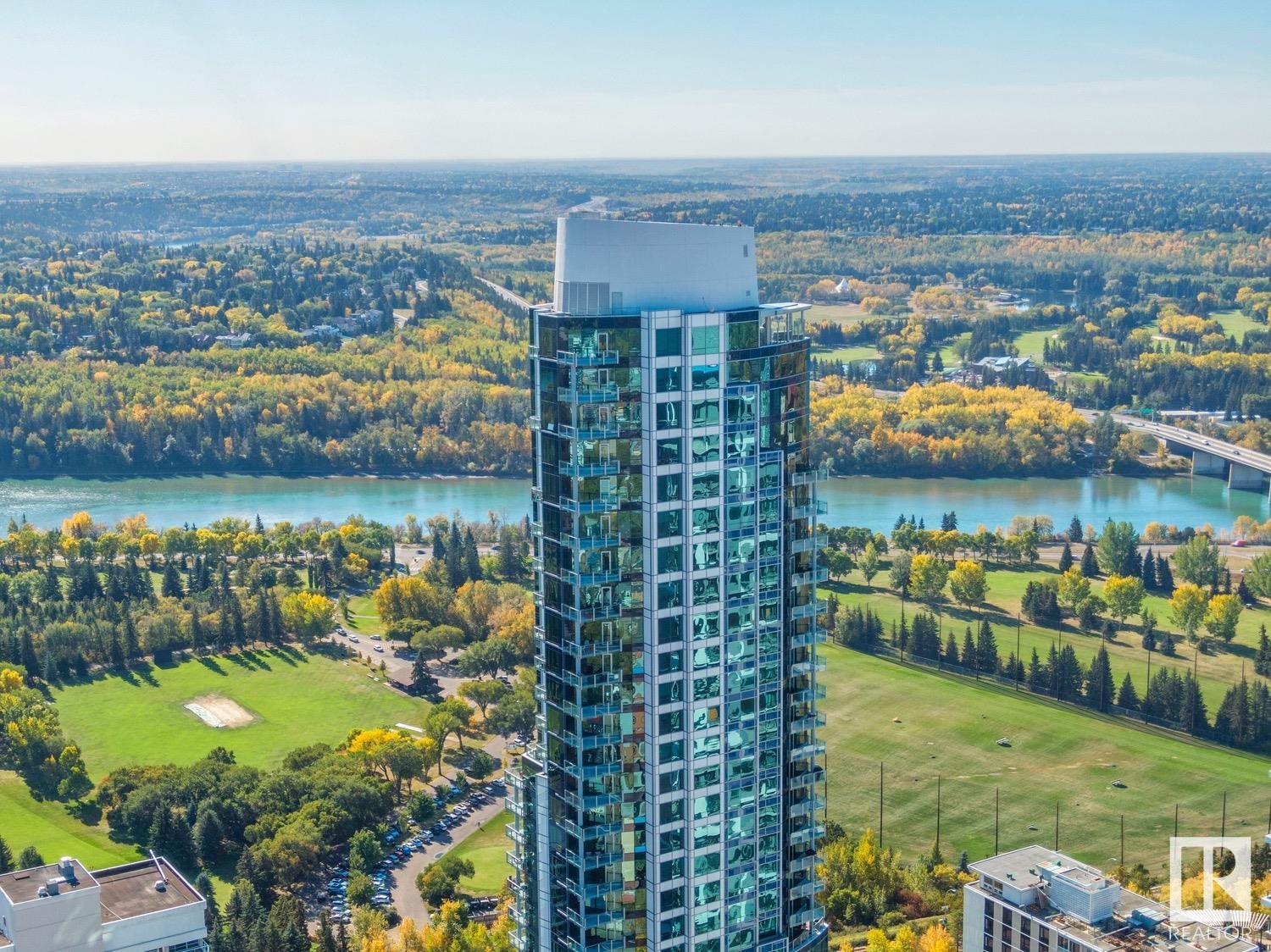 2 BED+DEN/2 BATH/2 TITLED UNDERGROUND STALLS in one of YEG’s finest developments. Pearl Tower is one of the only buildings to offer CONCIERGE SERVICES in YEG. From the elegant lobby to the impressive front doors of each suite, the quality of this building is clear. This CORNER UNIT boasts 2 BALCONIES & views of the DT skyline & River Valley. Warm hardwood runs throughout the unit, contrasted w. bright, white European cabinetry in the kitchen & bathrooms. Upgraded Bosch & JennAir appliances, stone tile & quartz countertops also compliment the fine finishes. Perfect for roommates (or houseguests), the floor plan has bedrooms on opposite sides of the home (each w. full bathrooms) & all closets have custom organizers. Integrated window coverings, fireplace & A/C are added bonuses for this property. 2 TITLED, UNDERGROUND stalls (1 with EV charging capabilities; rare to find in the core). The PET FRIENDLY building is complete w. gym, social room & is walking distance to River Valley, shopping & DT attractions.