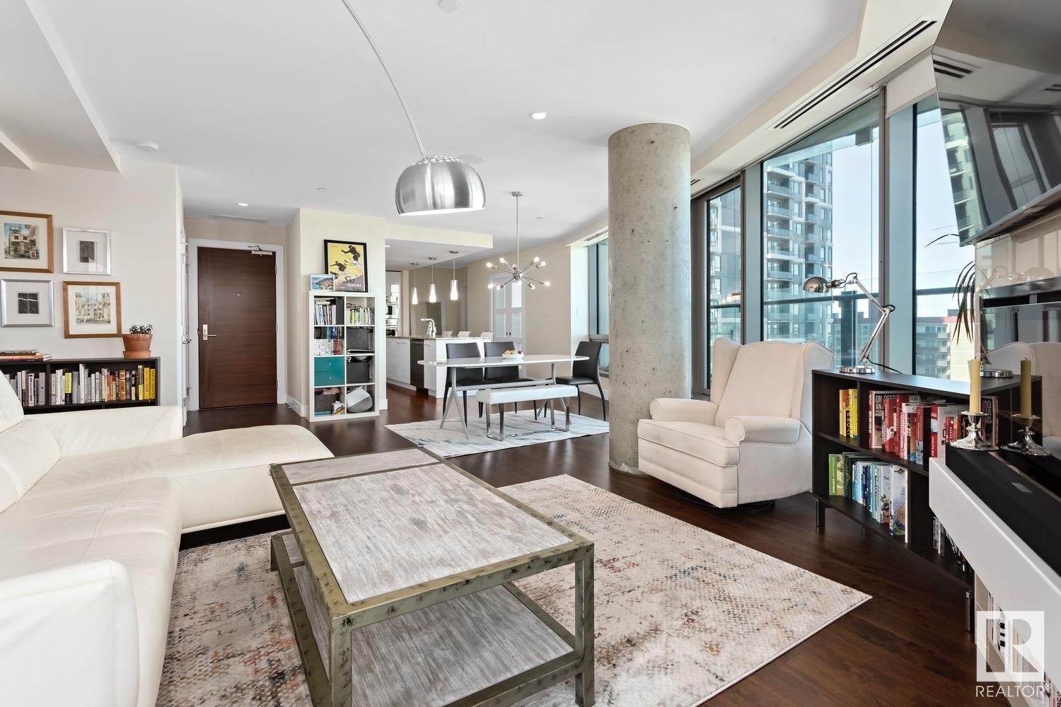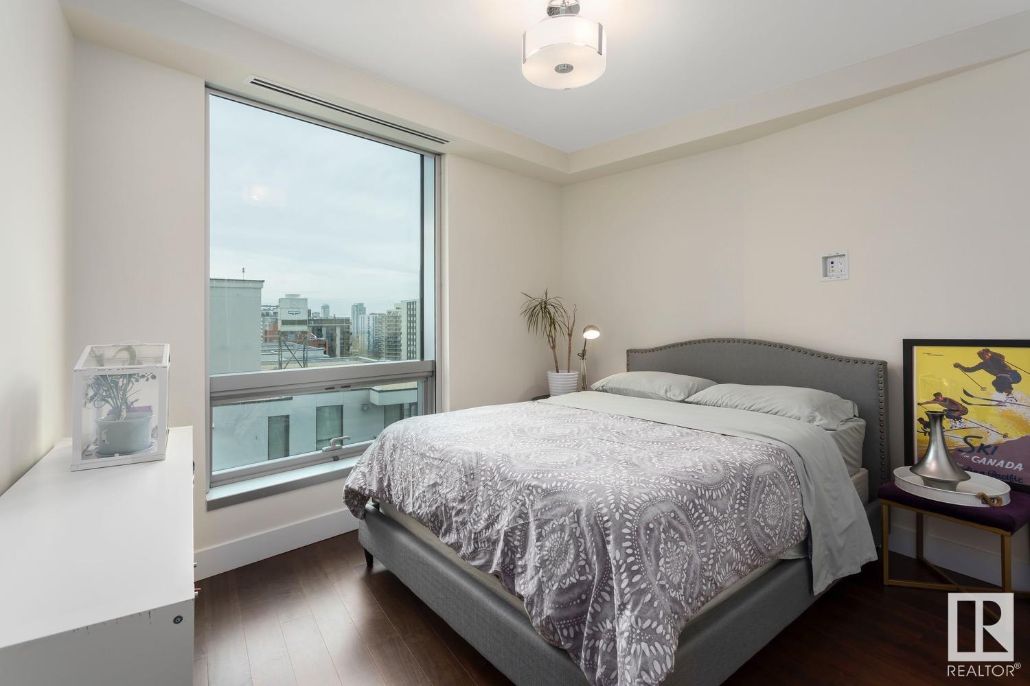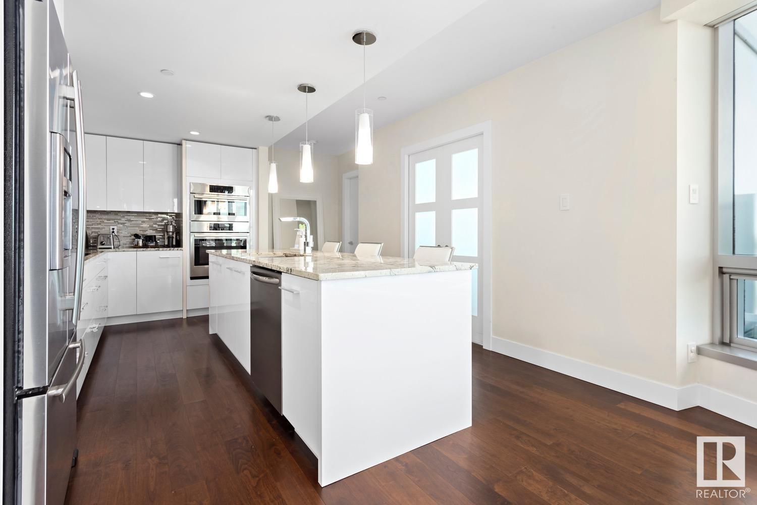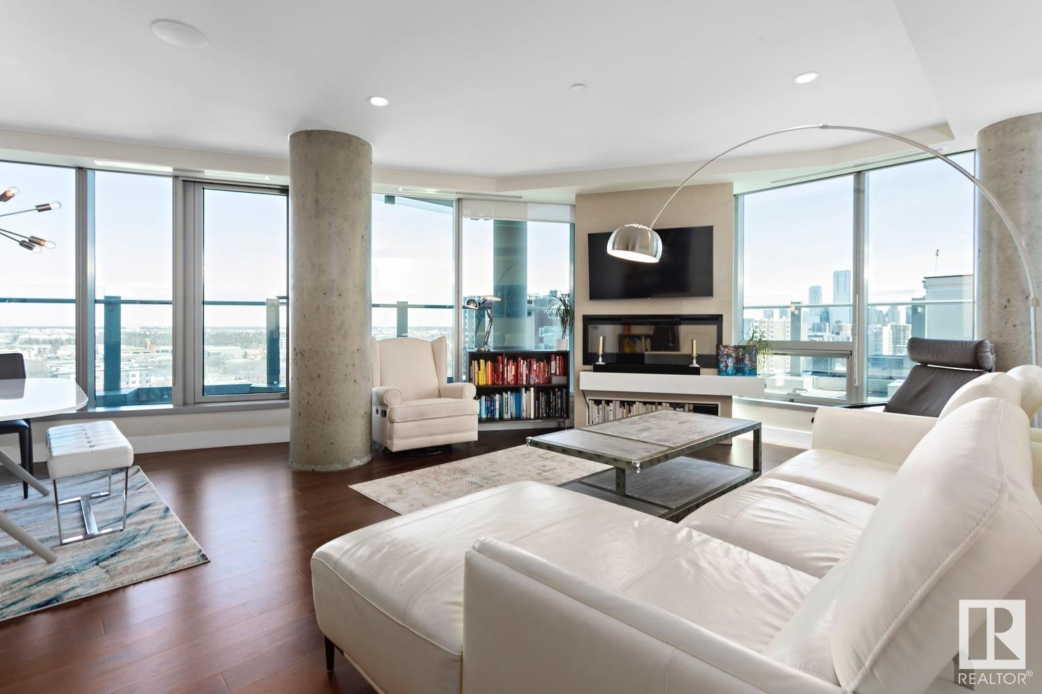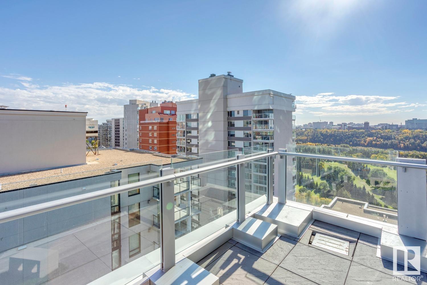 2 BED+DEN/2 BATH/2 TITLED UNDERGROUND STALLS in one of YEG’s finest developments. Pearl Tower is one of the only buildings to offer CONCIERGE SERVICES in YEG. From the elegant lobby to the impressive front doors of each suite, the quality of this building is clear. This CORNER UNIT boasts 2 BALCONIES & views of the DT skyline & River Valley. Warm hardwood runs throughout the unit, contrasted w. bright, white European cabinetry in the kitchen & bathrooms. Upgraded Bosch & JennAir appliances, stone tile & quartz countertops also compliment the fine finishes. Perfect for roommates (or houseguests), the floor plan has bedrooms on opposite sides of the home (each w. full bathrooms) & all closets have custom organizers. Integrated window coverings, fireplace & A/C are added bonuses for this property. 2 TITLED, UNDERGROUND stalls (1 with EV charging capabilities; rare to find in the core). The PET FRIENDLY building is complete w. gym, social room & is walking distance to River Valley, shopping & DT attractions.