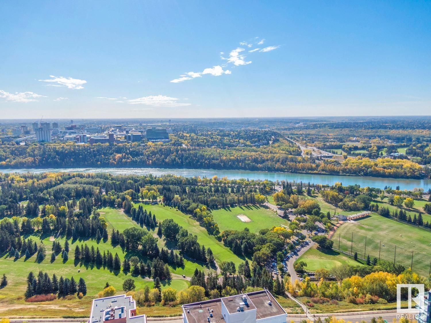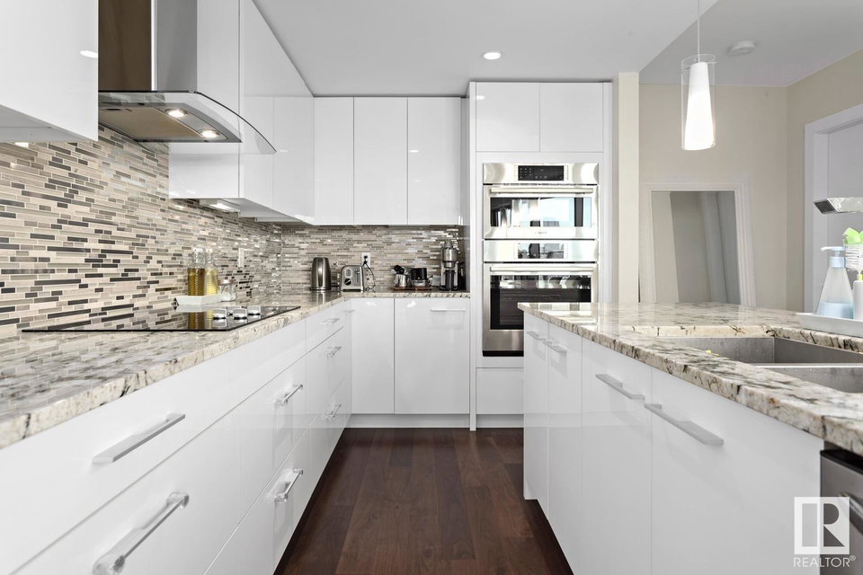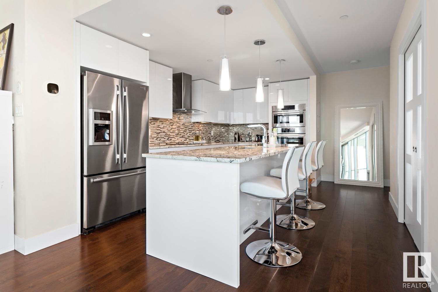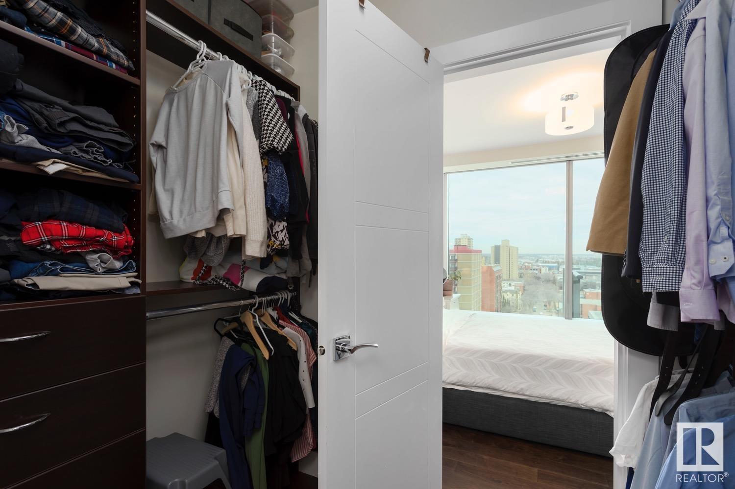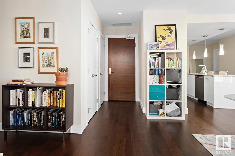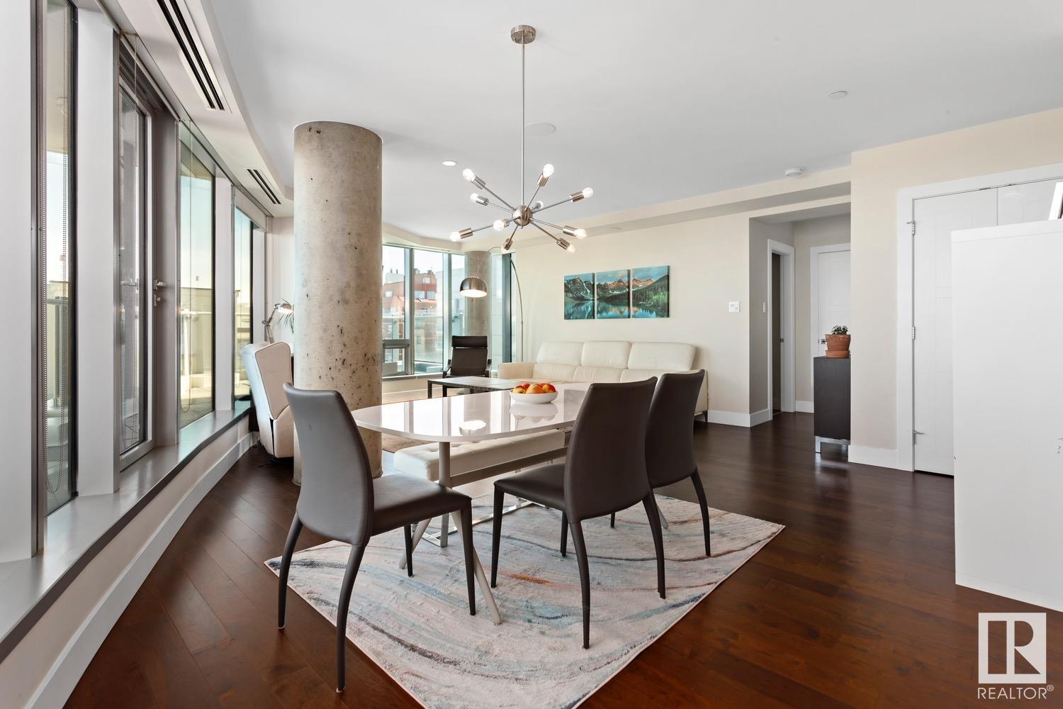 2 BED+DEN/2 BATH/2 TITLED UNDERGROUND STALLS in one of YEG’s finest developments. Pearl Tower is one of the only buildings to offer CONCIERGE SERVICES in YEG. From the elegant lobby to the impressive front doors of each suite, the quality of this building is clear. This CORNER UNIT boasts 2 BALCONIES & views of the DT skyline & River Valley. Warm hardwood runs throughout the unit, contrasted w. bright, white European cabinetry in the kitchen & bathrooms. Upgraded Bosch & JennAir appliances, stone tile & quartz countertops also compliment the fine finishes. Perfect for roommates (or houseguests), the floor plan has bedrooms on opposite sides of the home (each w. full bathrooms) & all closets have custom organizers. Integrated window coverings, fireplace & A/C are added bonuses for this property. 2 TITLED, UNDERGROUND stalls (1 with EV charging capabilities; rare to find in the core). The PET FRIENDLY building is complete w. gym, social room & is walking distance to River Valley, shopping & DT attractions.