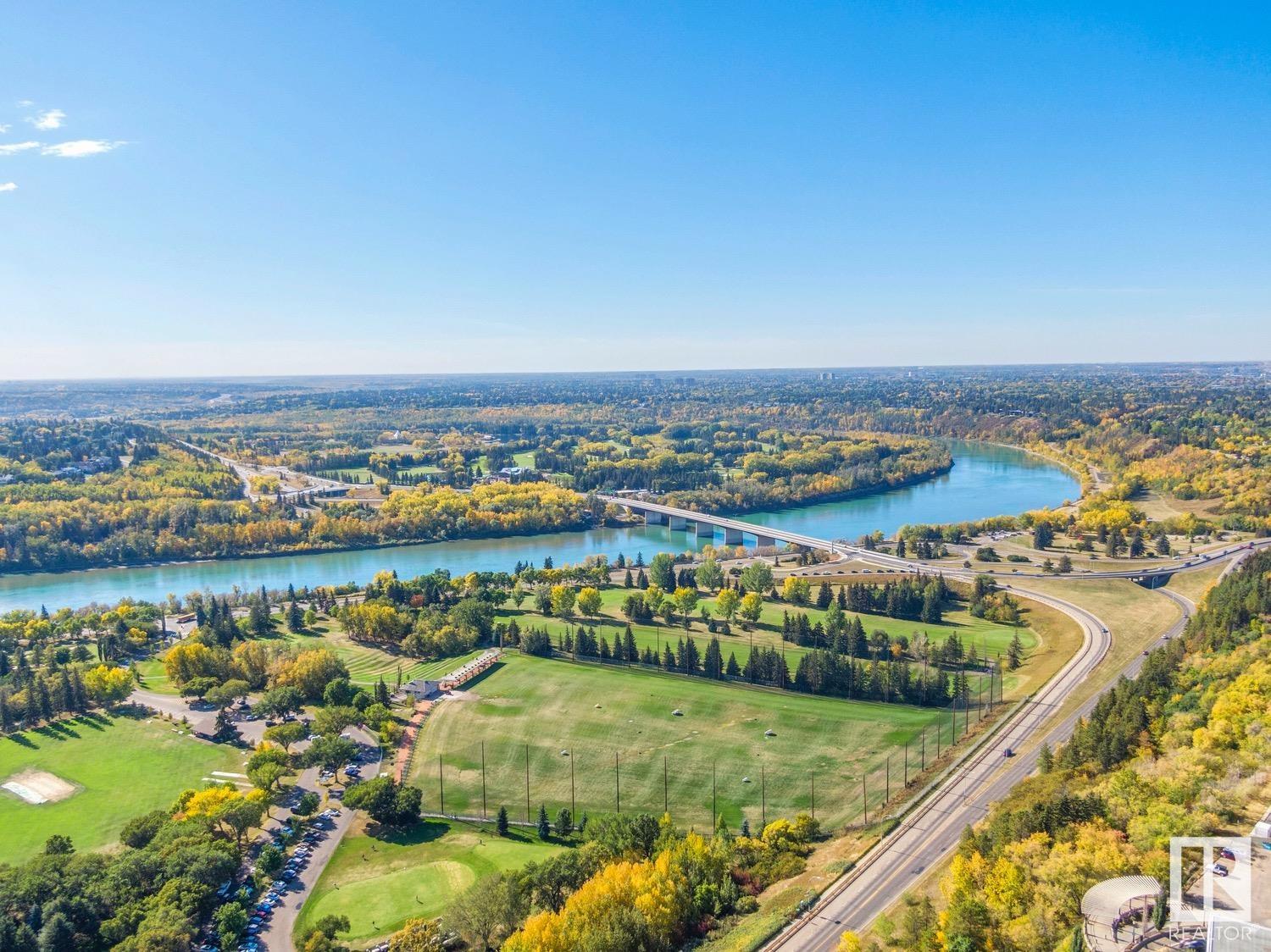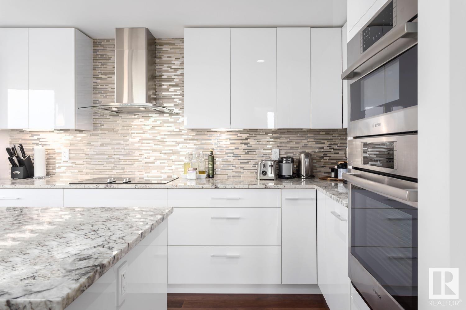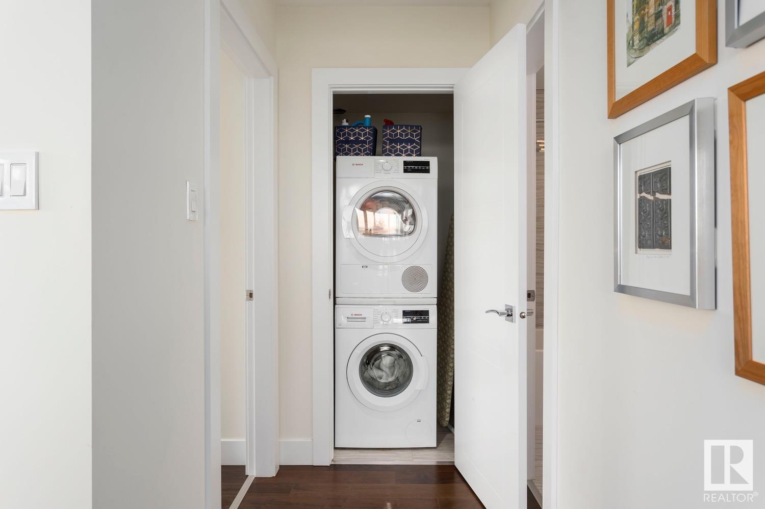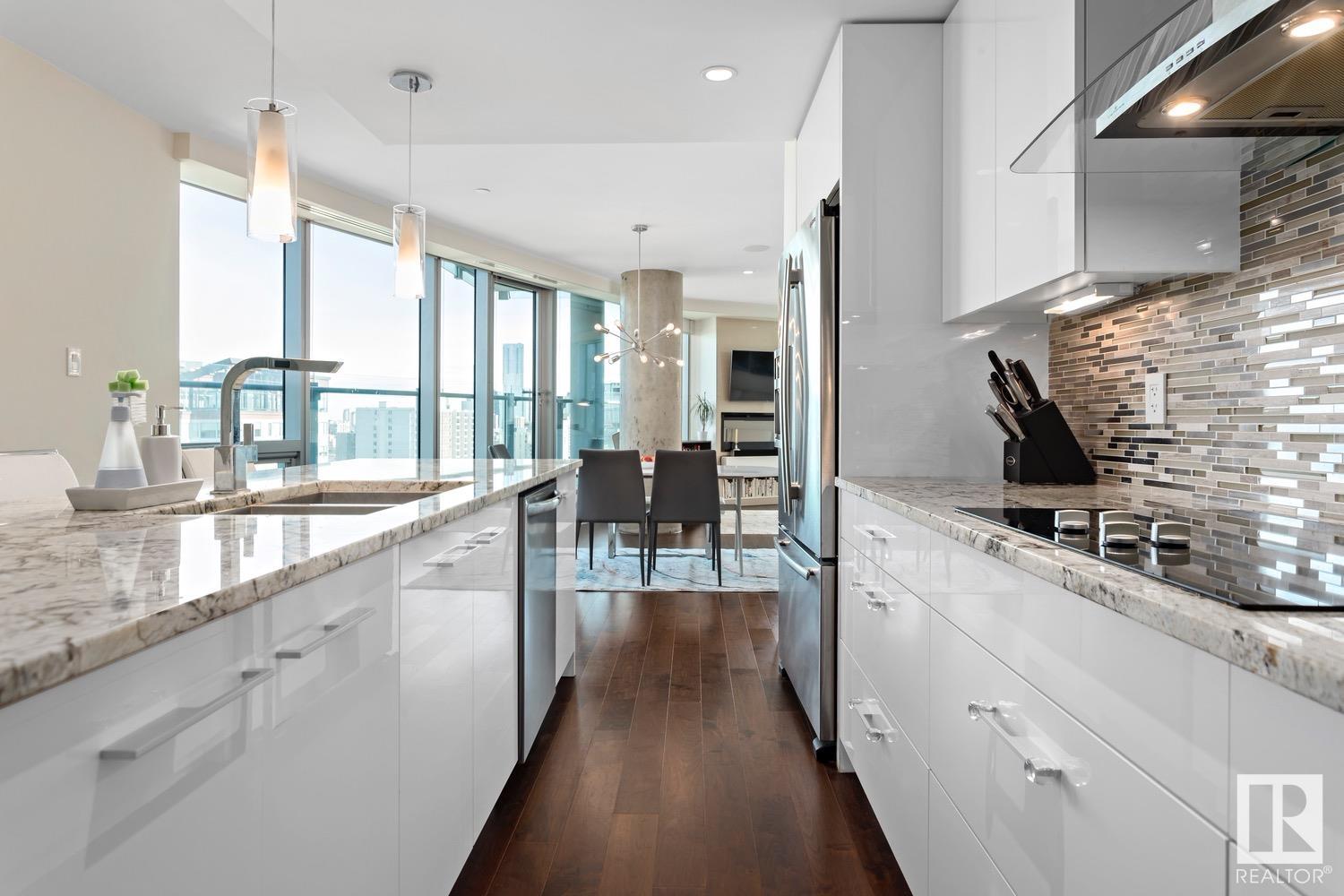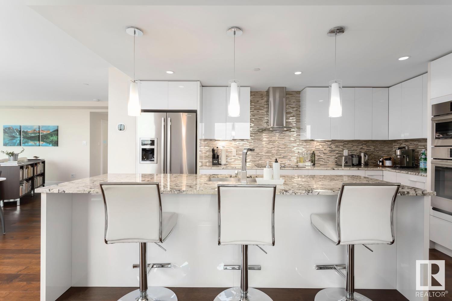 2 BED+DEN/2 BATH/2 TITLED UNDERGROUND STALLS in one of YEG’s finest developments. Pearl Tower is one of the only buildings to offer CONCIERGE SERVICES in YEG. From the elegant lobby to the impressive front doors of each suite, the quality of this building is clear. This CORNER UNIT boasts 2 BALCONIES & views of the DT skyline & River Valley. Warm hardwood runs throughout the unit, contrasted w. bright, white European cabinetry in the kitchen & bathrooms. Upgraded Bosch & JennAir appliances, stone tile & quartz countertops also compliment the fine finishes. Perfect for roommates (or houseguests), the floor plan has bedrooms on opposite sides of the home (each w. full bathrooms) & all closets have custom organizers. Integrated window coverings, fireplace & A/C are added bonuses for this property. 2 TITLED, UNDERGROUND stalls (1 with EV charging capabilities; rare to find in the core). The PET FRIENDLY building is complete w. gym, social room & is walking distance to River Valley, shopping & DT attractions.
