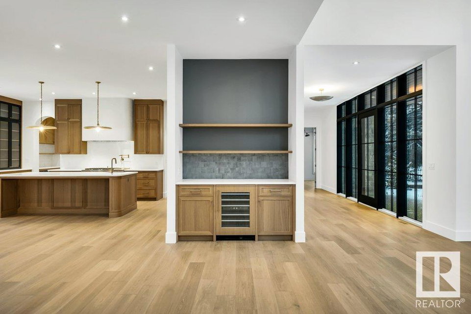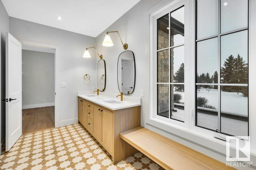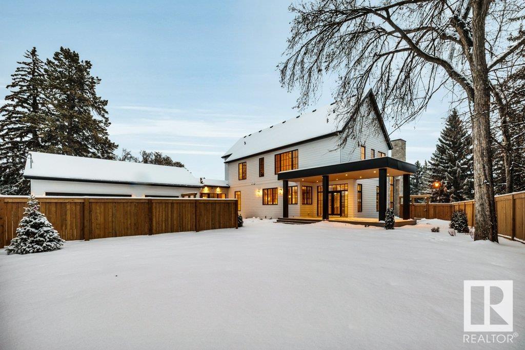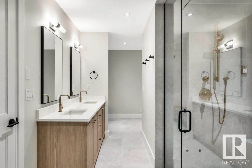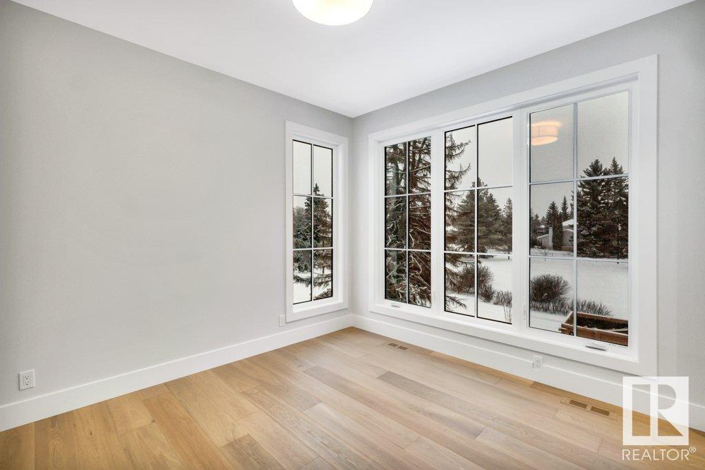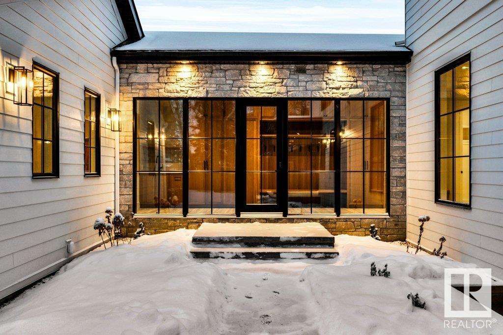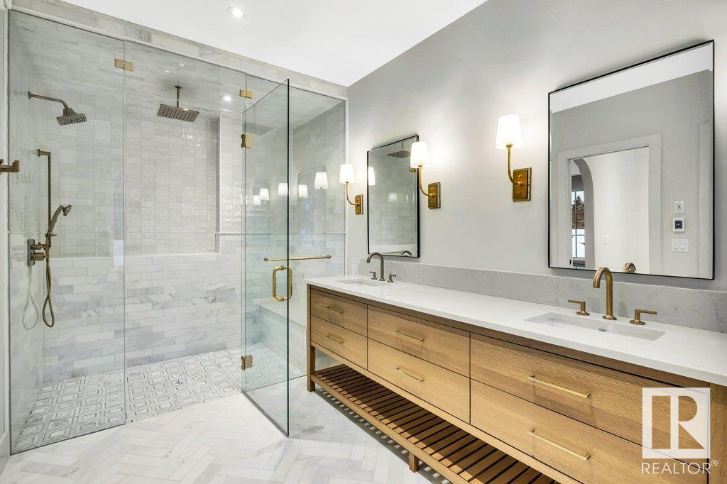 Situated on one of the only cul-de-sacs in East Crestwood, FC Developments’ latest custom estate features 6,500+sq.ft of developed living space on a 11,600sq.ft lot. 10′ ceilings greet you in the foyer & open up to a soaring 23’ vaulted ceiling in the living room. Custom cabinetry by Waygood can be found throughout the home, accented w integrated Jenn-Air appliances in the kitchen (incl 48″ gas range w double ovens & two dishwashers). Elegant archways & rounded corners are incorporated in the design incl the custom plaster hoodfan, oversized island & breakfast nook. An ATTACHED heated TRIPLE garage is connected by a breezeway; complete with custom storage, utility sink & large walk-in closet. Upstairs you’ll find 4 bedrooms with ENSUITES & WALK-IN CLOSETS FOR ALL. In the basement are 9′ ceilings, RADIANT HEATED floors, a custom bar area + built-ins, 2 add’l bedrooms (one styled as a GYM), a 4PC bath w a massive STEAMSHOWER connected to the gym area. Live steps from the River Valley in your own quiet oasis