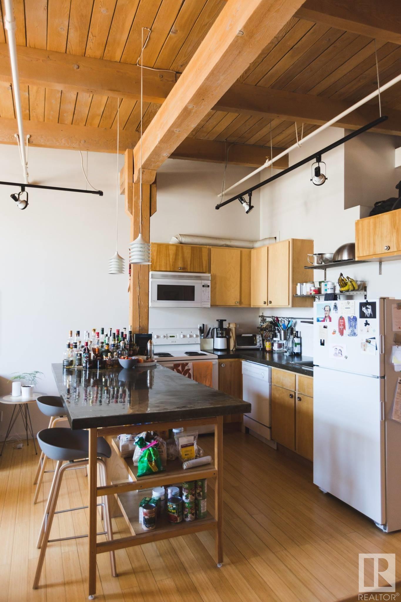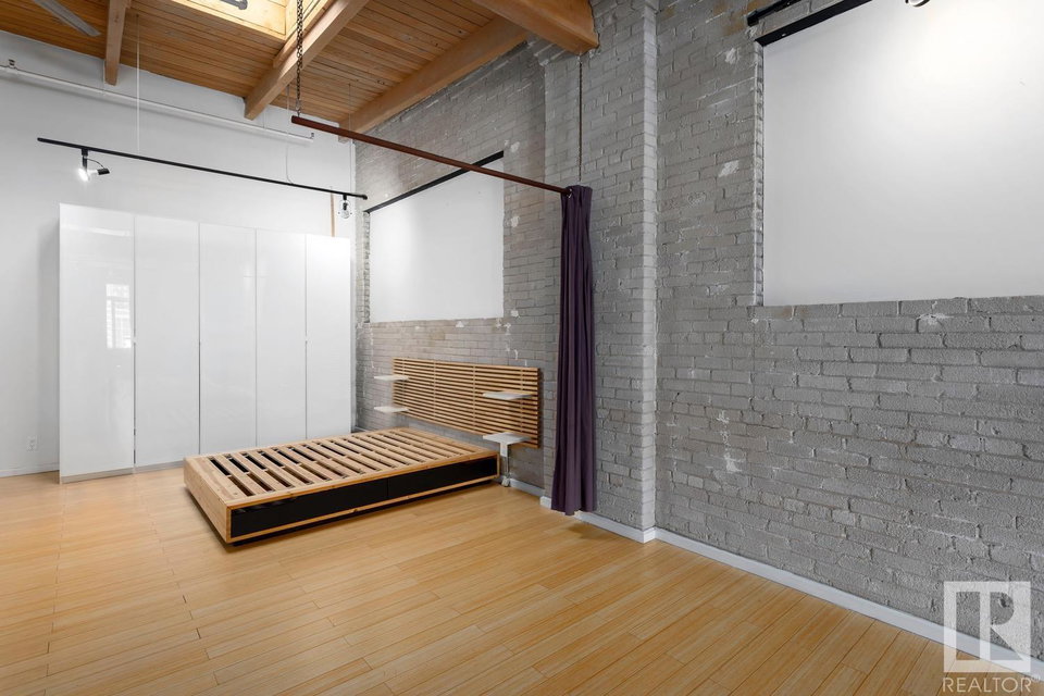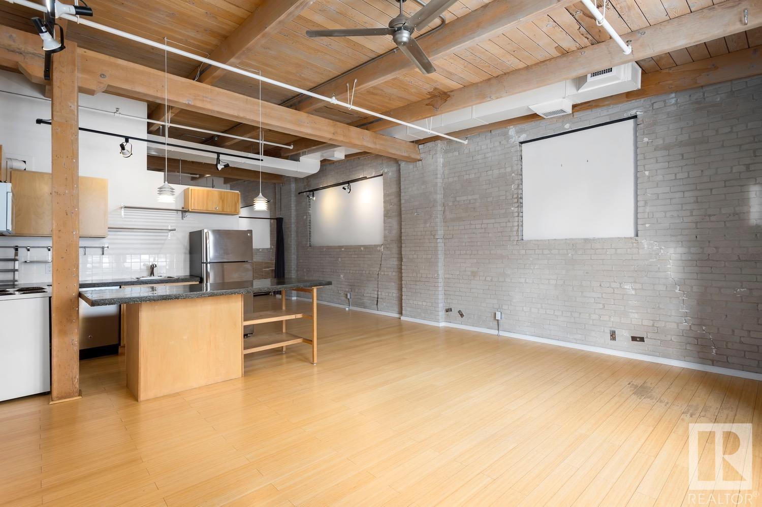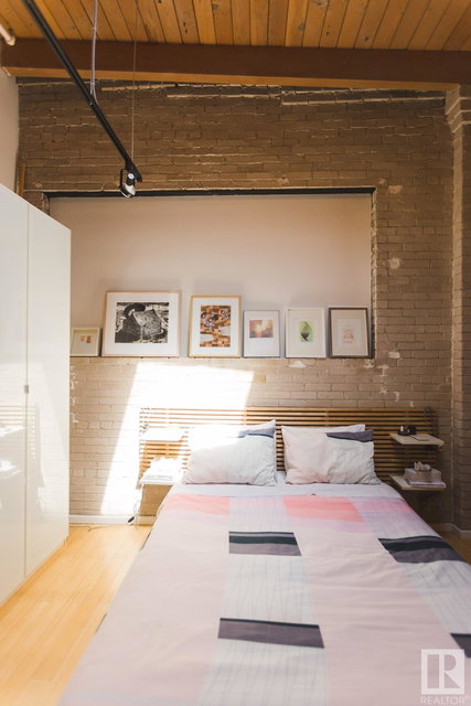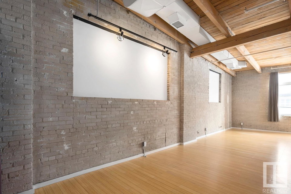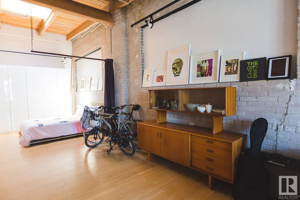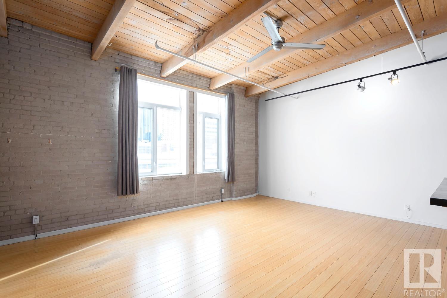 Incredible character LOFT with 12′, WOOD-BEAM ceilings & EXPOSED BRICK just steps from Macewan University & Corona LRT station. This historic property, redeveloped by Dub Architects, is what DT living is all about. The open-concept home has defined living spaces, all clad with bamboo hardwood. The kitchen features newer S/S appliances & concrete countertops. The vintage (70’s) IKEA pendants further emphasize the intriguing vibe this property embodies. Massive, East-facing windows showcase the DT-SKYLINE VIEW & flood the property with light. The 4PC bathroom was recently updated with bright, white subway tile & is adjacent the large bedroom area (complete with closable skylight). IN-SUITE LAUNDRY & an assigned PARKING stall complete this home. The building’s on-site caretaker keeps the common spaces looking beautiful & well-maintained. With reasonable condo fees & walkability to amenities such as grocery stores, 104 ST’s restaurants & bars, Rogers Place & public transit, this QUIET END-UNIT awaits!