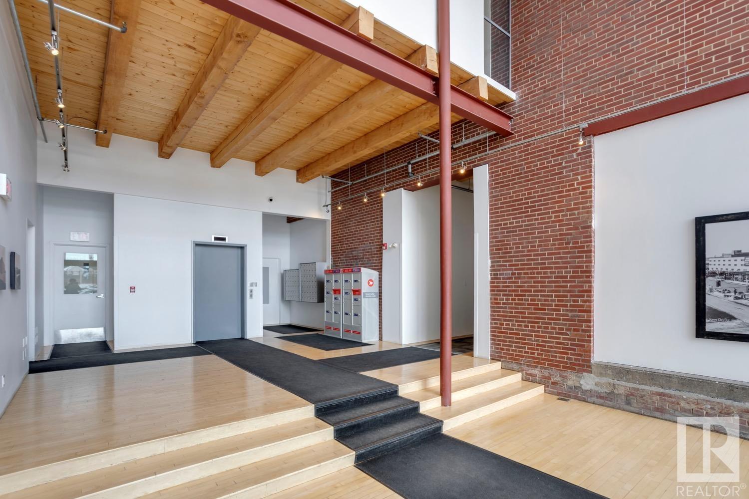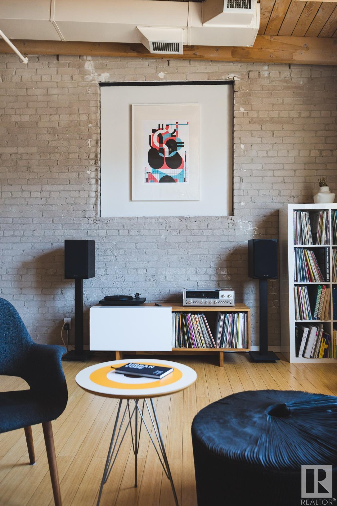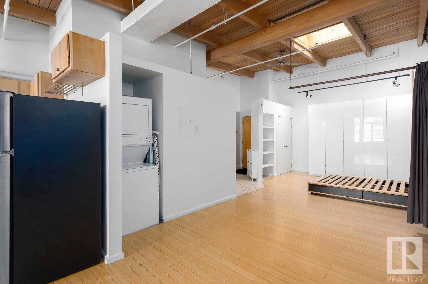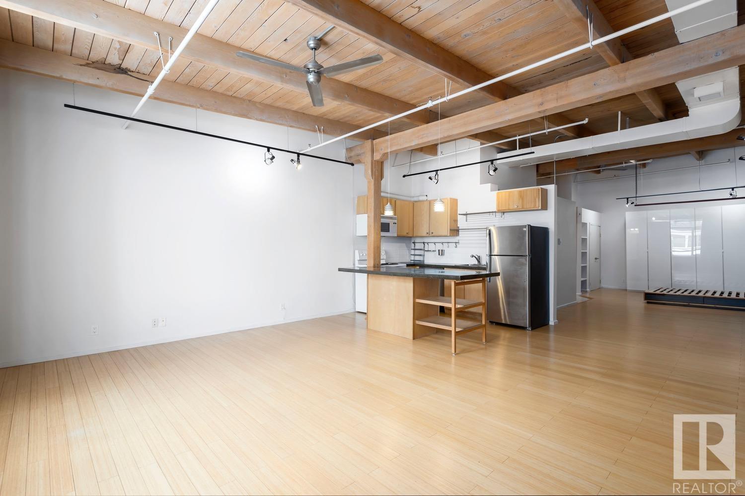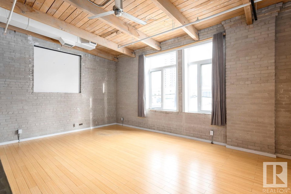 Incredible character LOFT with 12′, WOOD-BEAM ceilings & EXPOSED BRICK just steps from Macewan University & Corona LRT station. This historic property, redeveloped by Dub Architects, is what DT living is all about. The open-concept home has defined living spaces, all clad with bamboo hardwood. The kitchen features newer S/S appliances & concrete countertops. The vintage (70’s) IKEA pendants further emphasize the intriguing vibe this property embodies. Massive, East-facing windows showcase the DT-SKYLINE VIEW & flood the property with light. The 4PC bathroom was recently updated with bright, white subway tile & is adjacent the large bedroom area (complete with closable skylight). IN-SUITE LAUNDRY & an assigned PARKING stall complete this home. The building’s on-site caretaker keeps the common spaces looking beautiful & well-maintained. With reasonable condo fees & walkability to amenities such as grocery stores, 104 ST’s restaurants & bars, Rogers Place & public transit, this QUIET END-UNIT awaits!