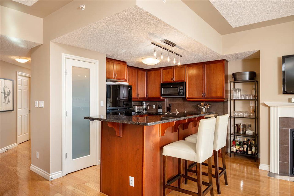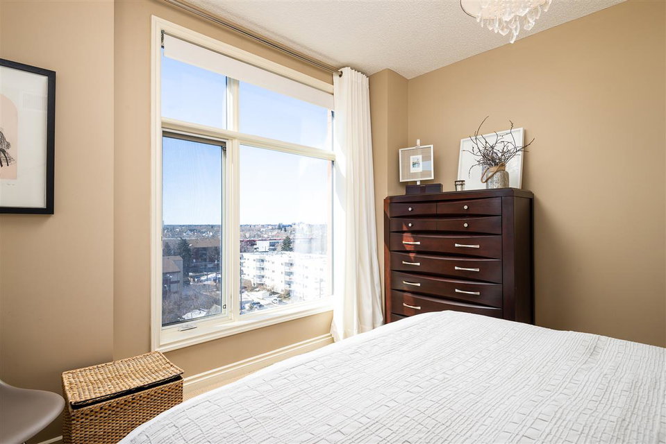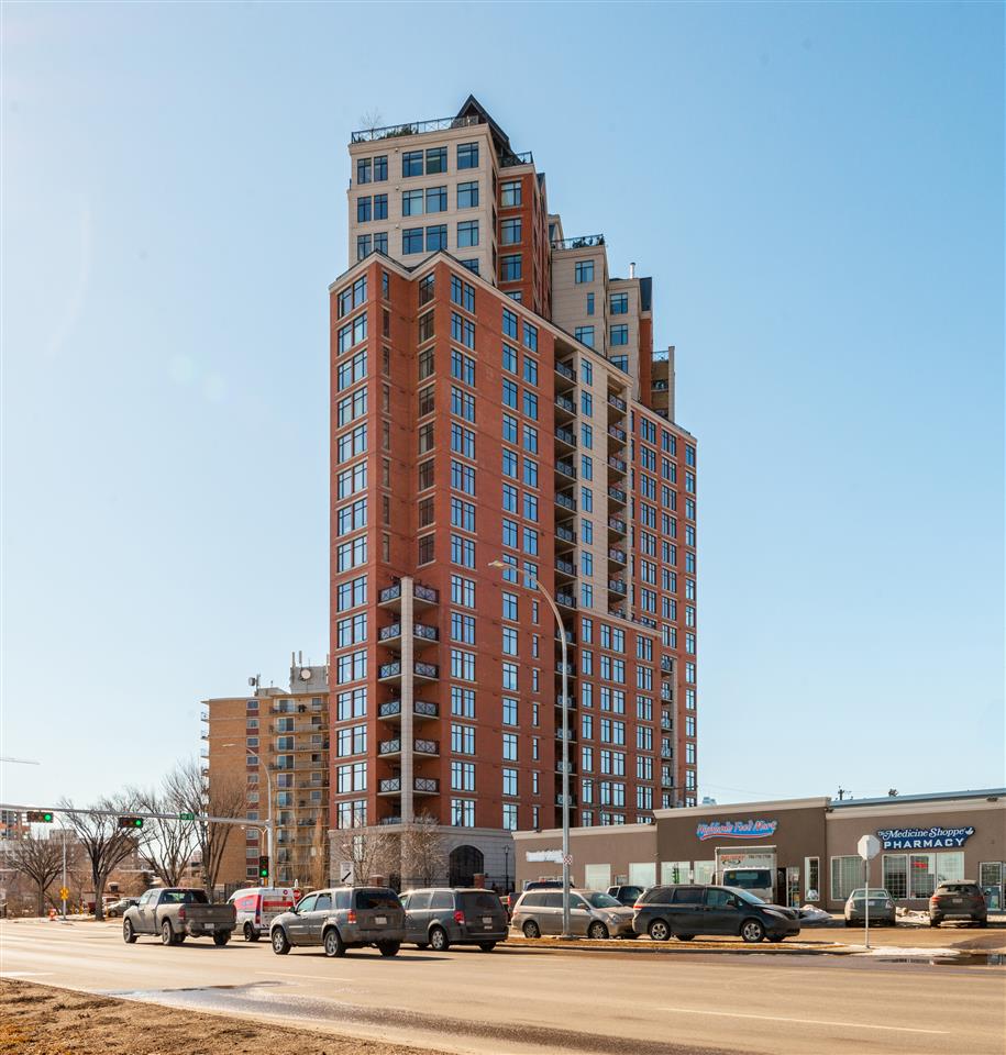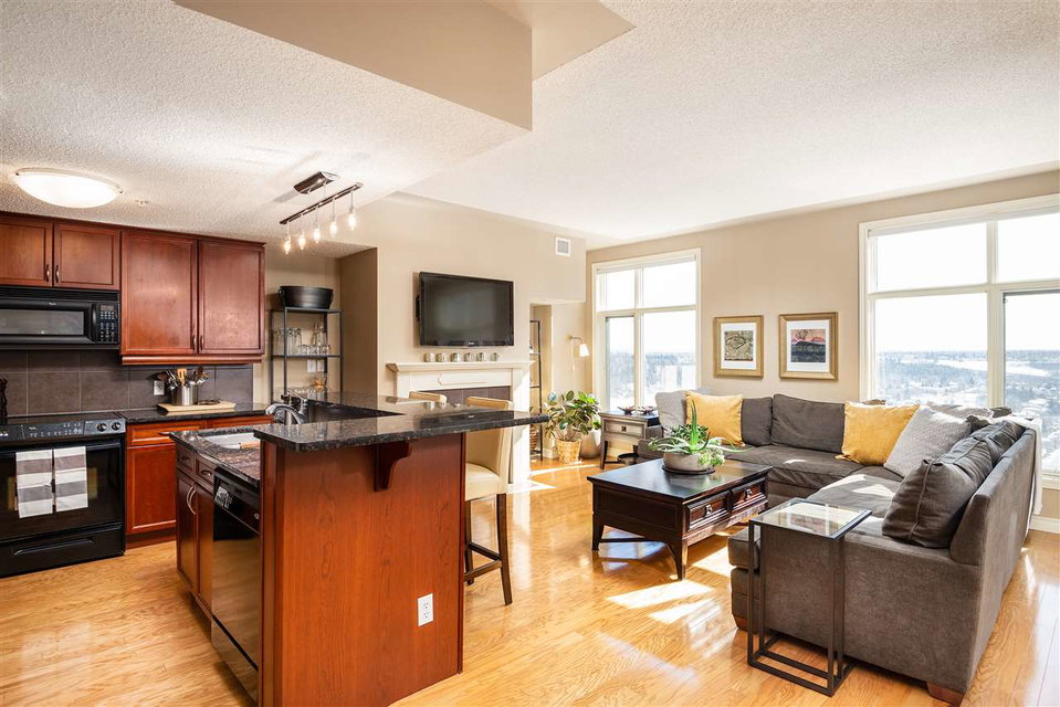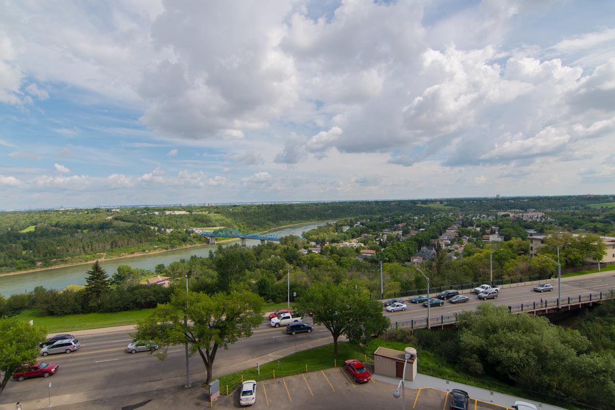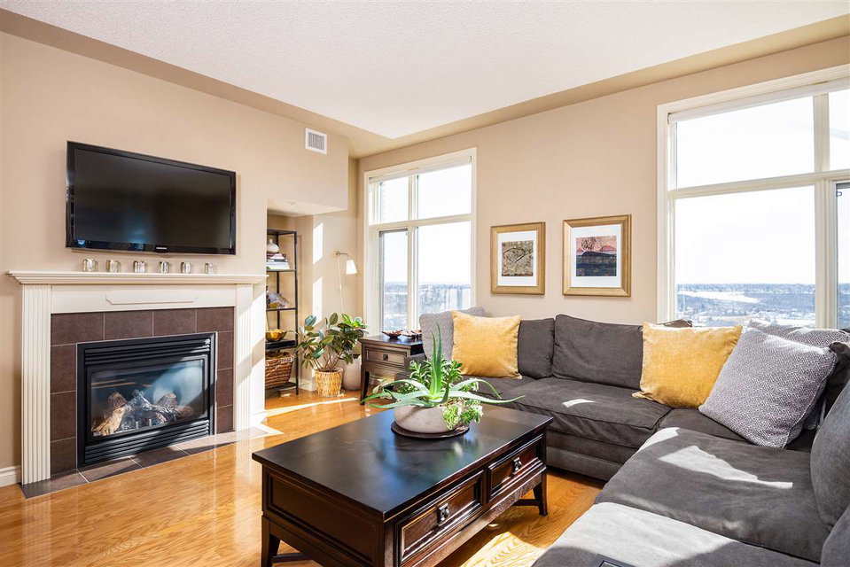 VIEWS VIEWS VIEWS! Welcome to 1,171 sq ft of luxurious, high-rise living in Edmonton’s core. This home features hardwood throughout the main living areas and unobstructed East views of the River Valley. The upgraded kitchen includes GRANITE countertops, cabinetry to the ceiling and a large pantry. The open-concept floor plan is perfect for entertaining with a seamless integration of the kitchen, living room (w. gas fireplace) and large dining area. The spacious master suite has a walk-in closet and 4-pc ensuite bathroom, with views of the downtown skyline and Roger’s Place. The den can be used as a nursery, guest room or office. Completing this home is a second full bathroom (3-pc), large in-suite laundry room, plenty of storage and A/C. A titled, underground stall and access to amenities such as the fitness facility make living at Jasper Properties a wise investment – all of this just steps away from the Downtown core. All utilities included in condo fee!