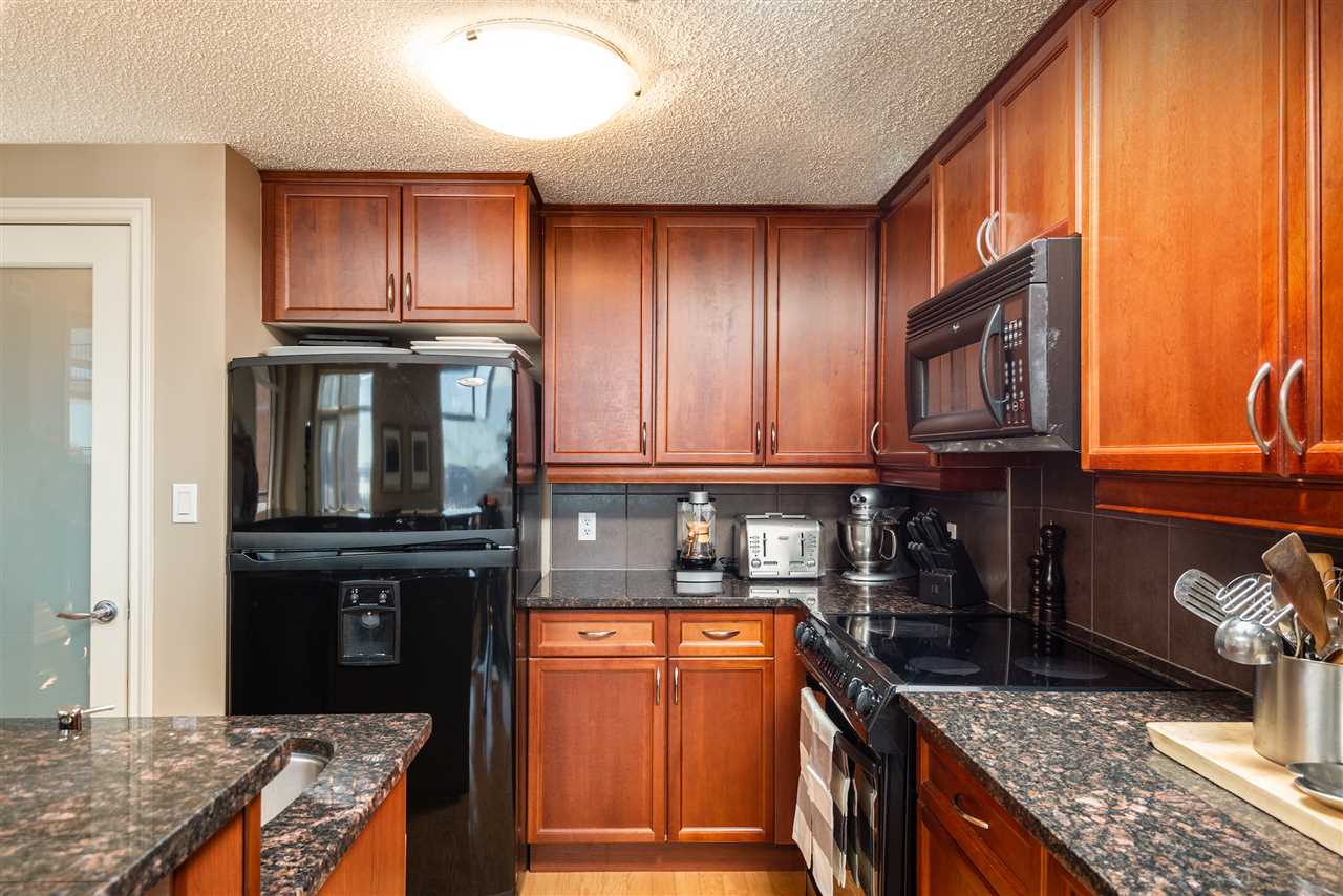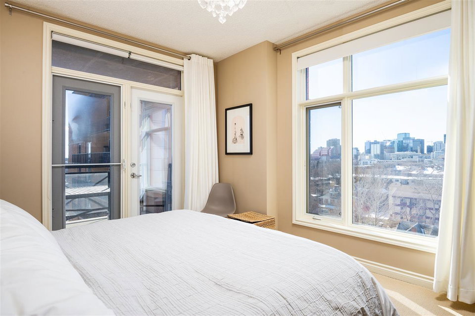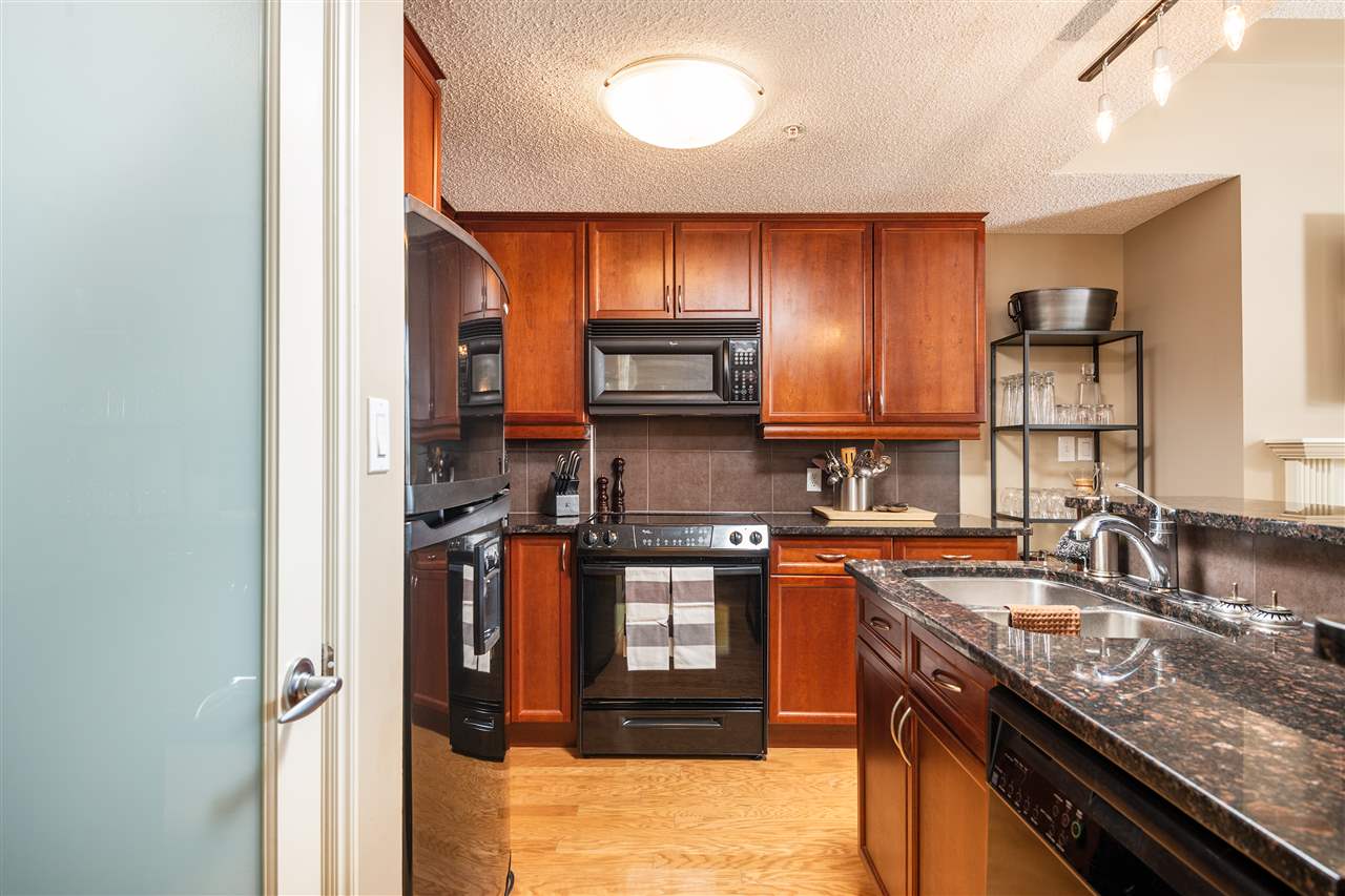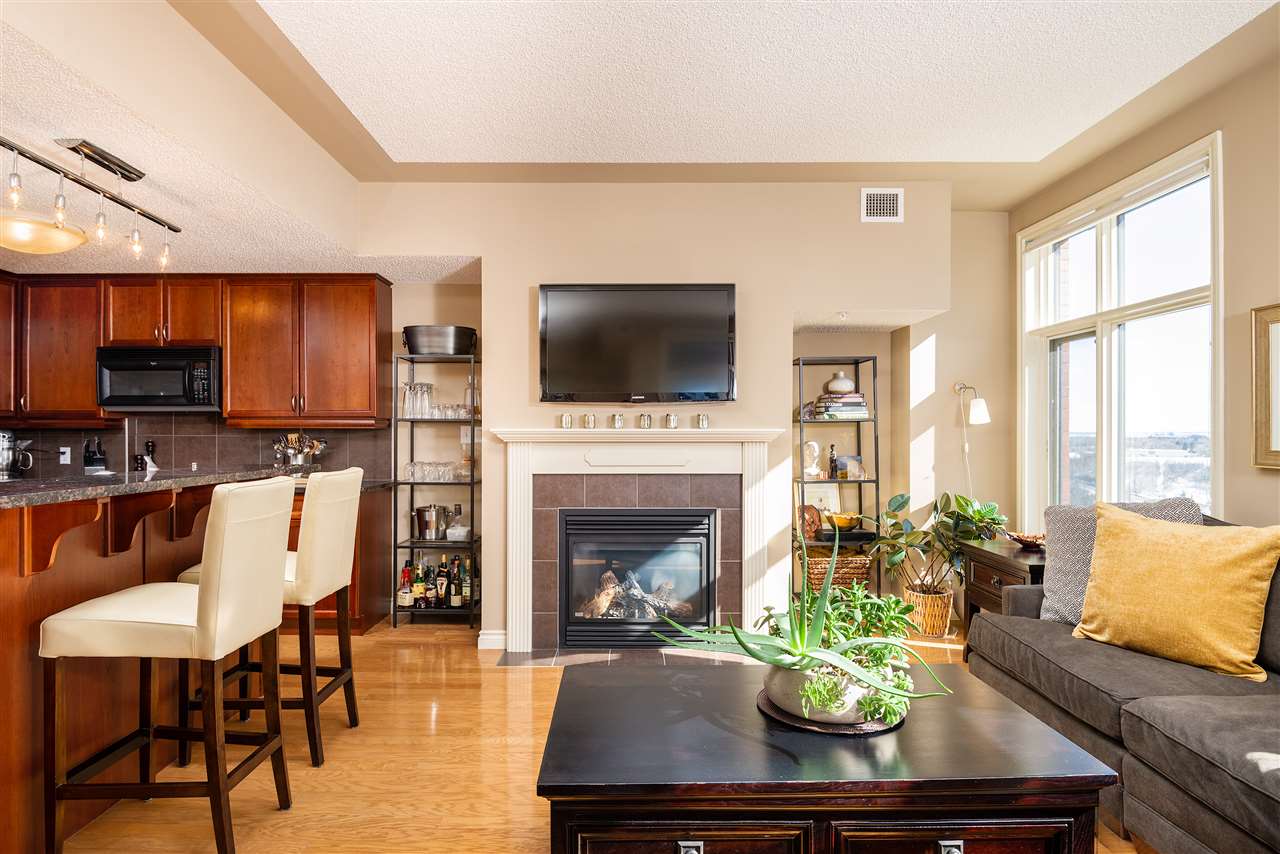 VIEWS VIEWS VIEWS! Welcome to 1,171 sq ft of luxurious, high-rise living in Edmonton’s core. This home features hardwood throughout the main living areas and unobstructed East views of the River Valley. The upgraded kitchen includes GRANITE countertops, cabinetry to the ceiling and a large pantry. The open-concept floor plan is perfect for entertaining with a seamless integration of the kitchen, living room (w. gas fireplace) and large dining area. The spacious master suite has a walk-in closet and 4-pc ensuite bathroom, with views of the downtown skyline and Roger’s Place. The den can be used as a nursery, guest room or office. Completing this home is a second full bathroom (3-pc), large in-suite laundry room, plenty of storage and A/C. A titled, underground stall and access to amenities such as the fitness facility make living at Jasper Properties a wise investment – all of this just steps away from the Downtown core. All utilities included in condo fee!
